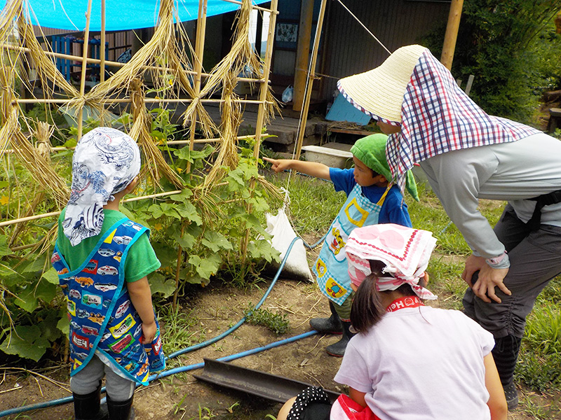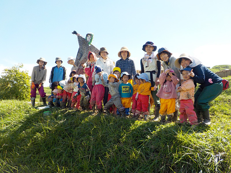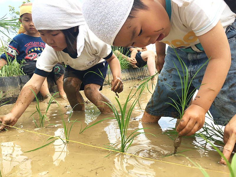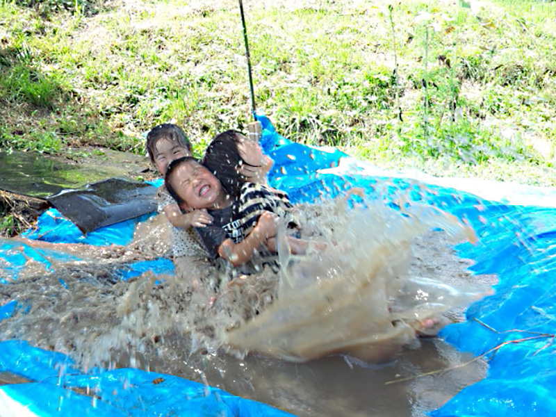 棚田に田んぼをもち、米作りをしながら、カエルやドジョウとり、お花摘みやごっこあそび、季節の巡りを感じながらたくさんの生き物や植物と触れ合い遊びます。